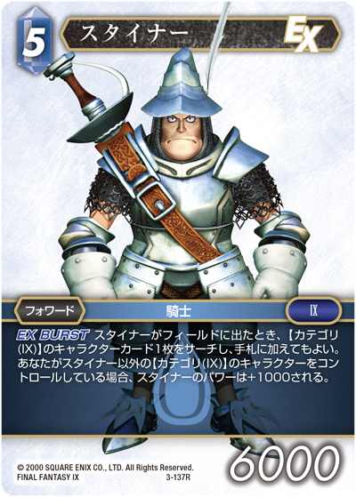 【3-137R】スタイナーもここに上手くハマります。というのも、【8-115L】ジタンだけではなく、あたながデッキに組んだそのほかの【カテゴリ(IX)】 のキャラクターカード1枚をサーチできるのですが、「EX バースト」もあるため、あなたのターンになった段階でより多くのカードが手札にある状況となる可能性があります。