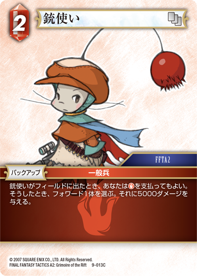 銃使いがフィールドに出たとき、あなたは《火》を支払ってもよい。そうしたとき、フォワード1体を選ぶ。それに5000ダメージを与える。