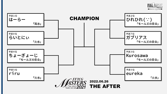 お互い2ターン目には2属性のバックアップを出し合い、「風氷」がさっそく【12-116L】ロックを出していきますが、「火水」も【15-119L】ポロムと【15-011L】パロムをそろえ、デッキを象徴するフォワードが双方のフィールドに並び立ちます。フォワードが除去され続ける状況を避けるため、はーらーさんは【14-042L】雲神ビスマルクや【14-049H】テュポーンで対処しながら少しずつアタックしていきますが、そのたびにEXバーストを受けてしまい、フォワードがいなくなってしまいます。最終的には30分の制限時間が切れるまでもつれる展開となりましたが、最後は攻める手段も守る手勢も尽きてしまったはーらーさんが投了し、riruさんが『FINAL』に続いて2日連続での決勝進出を果たしました。
