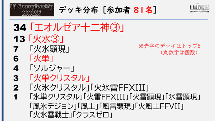 『深淵のガンスリンガー』環境での公式トーナメントは『MASTERS 2025 3rd season』が4回開催され、優勝は「エオルゼア十二神」が3回、「ソルジャー」が1回という結果でした。「エオルゼア十二神」は4大会すべてで使用率トップでもあり、まさしく現在のL3構築を代表するデッキです。反面、ゲーム序盤の不安定さという明確な課題も抱えたデッキであり、その点をテーマとしたメタゲームの中に「ソルジャー」「火氷顕現」「火水」「火氷雷FFXIII」といった有力デッキが存在するという状況でした。