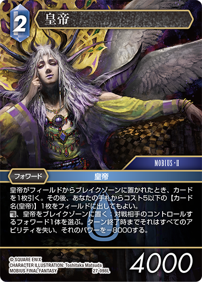週に一度の新カード紹介コーナー「今週の一枚」の時間がやってまいりました。11月14日発売予定の新ブースターパック『発見の旅路』から今週ご紹介するのは『FINAL FANTASY II』のラスボスである【27-098L】皇帝です。こちらのイラストは『MOBIUS FINAL FANTASY』出典のもので、ただの皇帝ではなくゲームボーイアドバンス以降のソフトからの追加要素である『Soul of Re・birth』に登場する善の皇帝をモチーフとしたものになっています。カード画像をご覧いただきつつ、カードの説明に入っていきましょう。