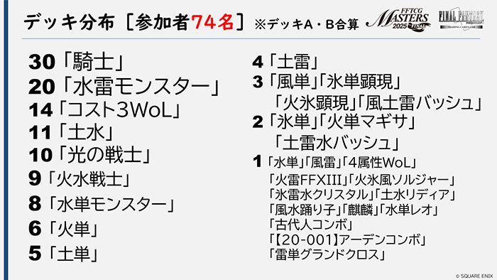 全勝はおらず7勝1敗が2名、6勝2敗が10名、そして5勝3敗からタイブレークで通過した4名が翌日の決勝ラウンドへ駒を進めました。トップ16の使用デッキは「騎士」がシェア1位を守りつつ、水単と水雷の「モンスター」デッキが存在感を増す結果となっています。「麒麟」「古代人コンボ」など、使用者1人から勝ち上がってきたデッキも印象的でした。