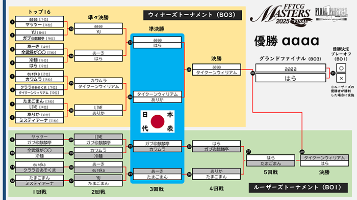 ウィナーズトーナメントを勝ち上がったaaaaさん、ありかさん、タイクーンウィリアムさん、ルーザーズトーナメントを突破したあーきさん、ガブ@麒麟亭さん、カワムラさん、たまごまんさん、そしてはらさんがウィナーズトーナメント準決勝に進んだことにより、権利の繰り下がり(ルーザーズトーナメント2回戦の敗者で予選ラウンド最上位)で冷麺さんが『世界選手権 2025』の権利を獲得されました。おめでとうございます!